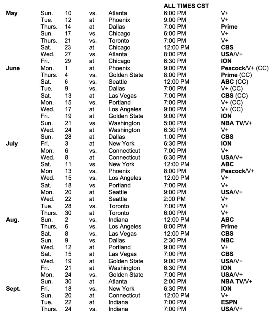 Minnesota’s schedule includes 28 nationally televised games, up from 21 in the 2025 season, that will air on ABC (June 6 vs. Seattle, July 11 vs. New York, Aug. 2 vs. Indiana), CBS (May 23 at Chicago, June 13 at Las Vegas, June 28 at Dallas, Aug. 8 vs. Las Vegas and Aug. 15 at Las Vegas), ESPN (Sept. 22 at Indiana) and ION (May 29 at Chicago, June 19 at Golden State, July 3 at New York, Aug. 21 at Washington and Sept. 18 vs. New York). Additionally, games will air on NBC (Aug. 9 vs. Dallas), Peacock (June 1 at Phoenix, July 13 vs. Phoenix) and USA Network (May 27 vs. Atlanta, July 8 at Connecticut, July 20 at Seattle, Aug. 19 at Golden State, Aug. 24 vs. Golden State, Sept. 24 vs. Indiana). Prime Video will stream three games (May 14 at Dallas, June 4 vs. Golden State and Aug. 6 vs. Los Angeles), and NBA TV will carry two games (June 21 vs. Washington and Aug. 30 at Atlanta).
